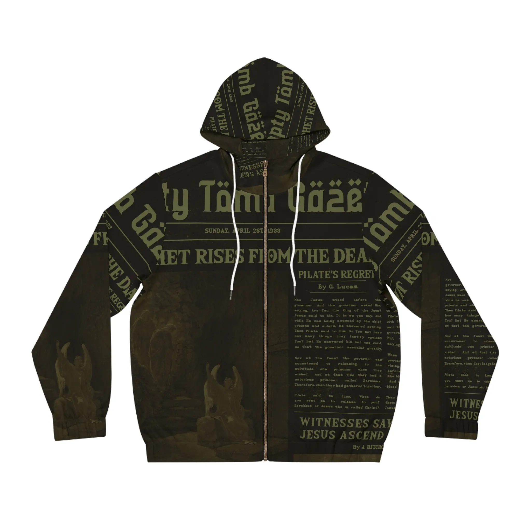 Stay warm and share the greatest headline in history with this black full zip hoodie featuring the “Empty Tomb” vintage-style design in a subtle green font. Declaring the powerful truth “The Tomb Is Empty – He Is Risen!” it blends understated style with an eternal message.