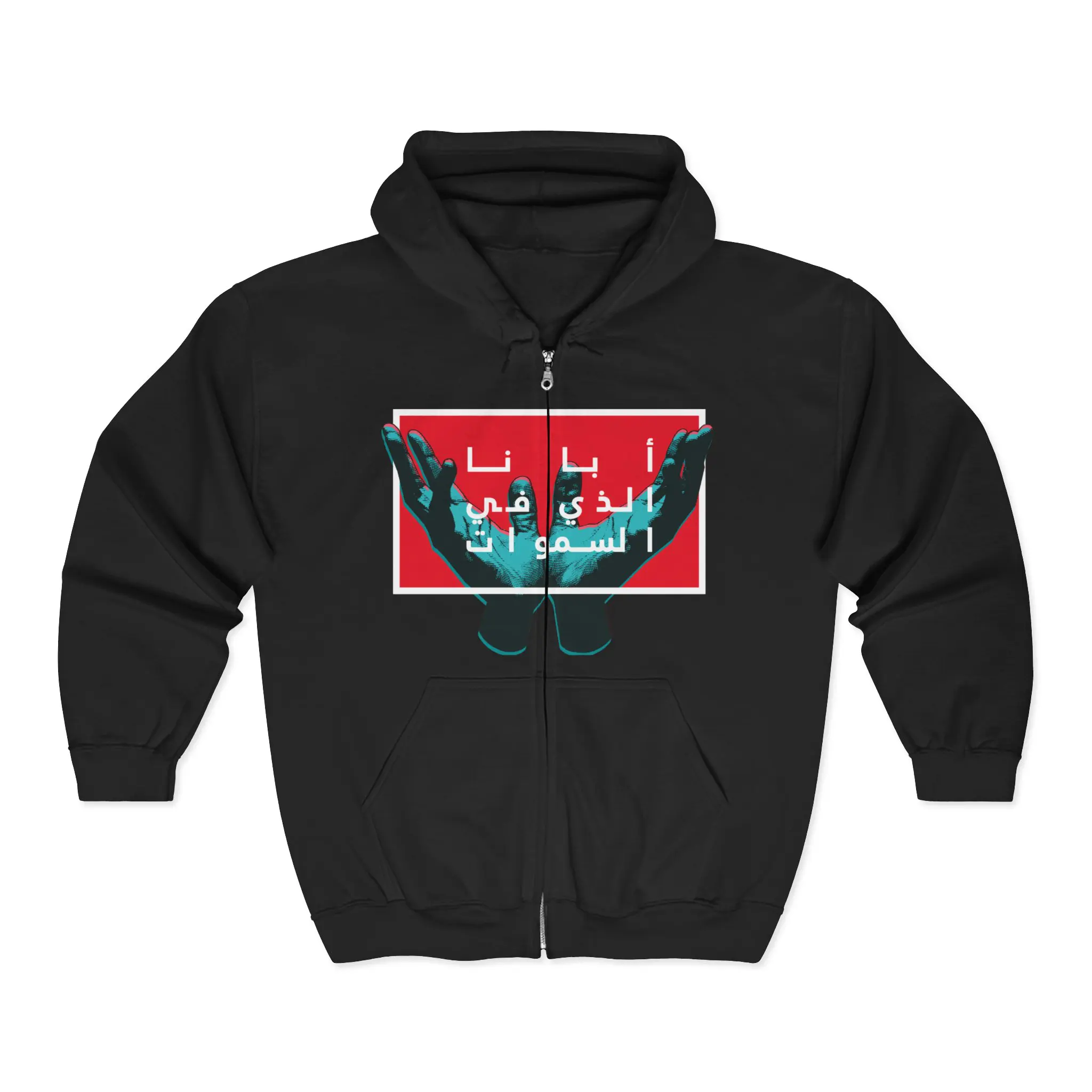 This powerful black full-zip hoodie features reverent prayer hands paired with the Lord’s Prayer—“Our Father Who Art in Heaven”—beautifully written in Arabic script.