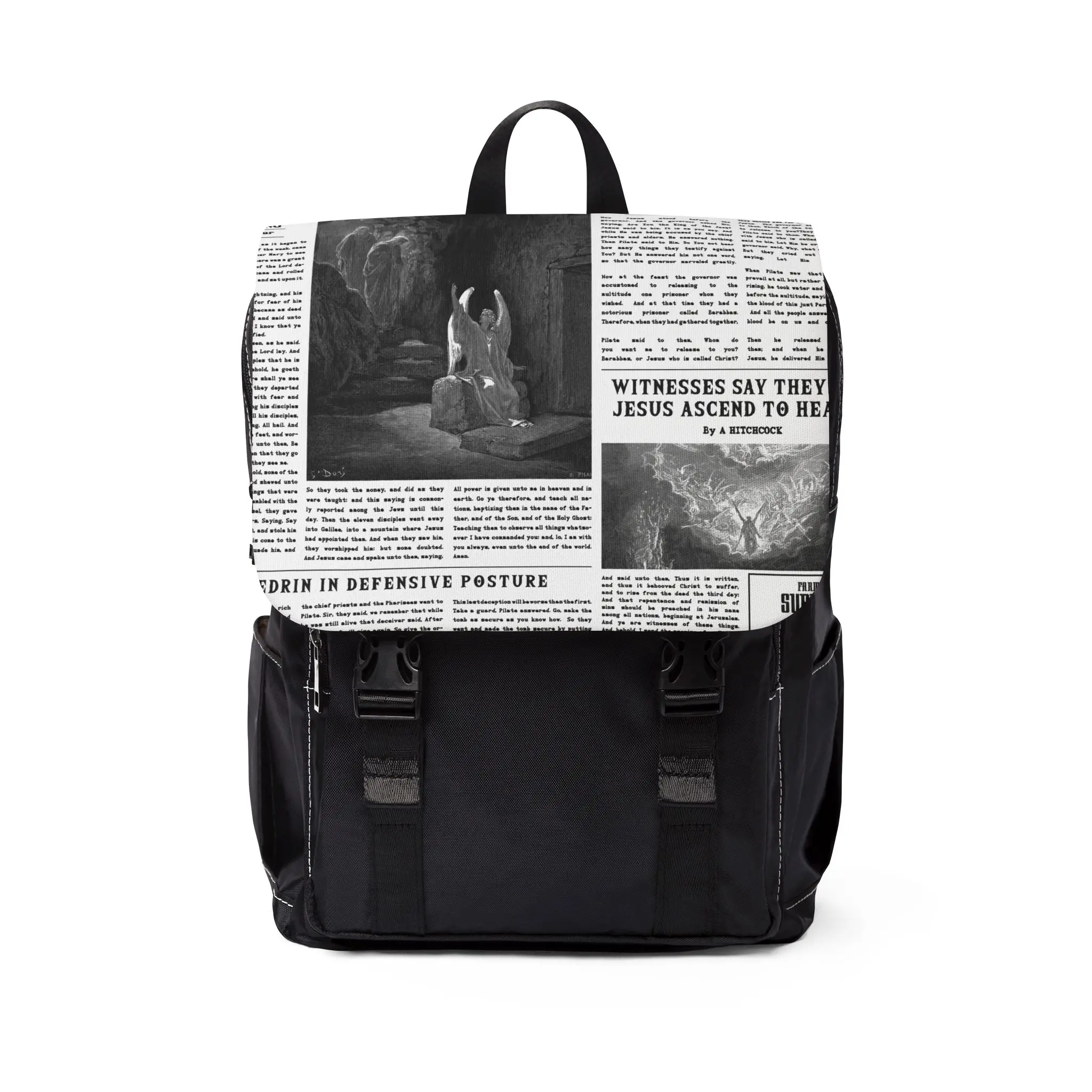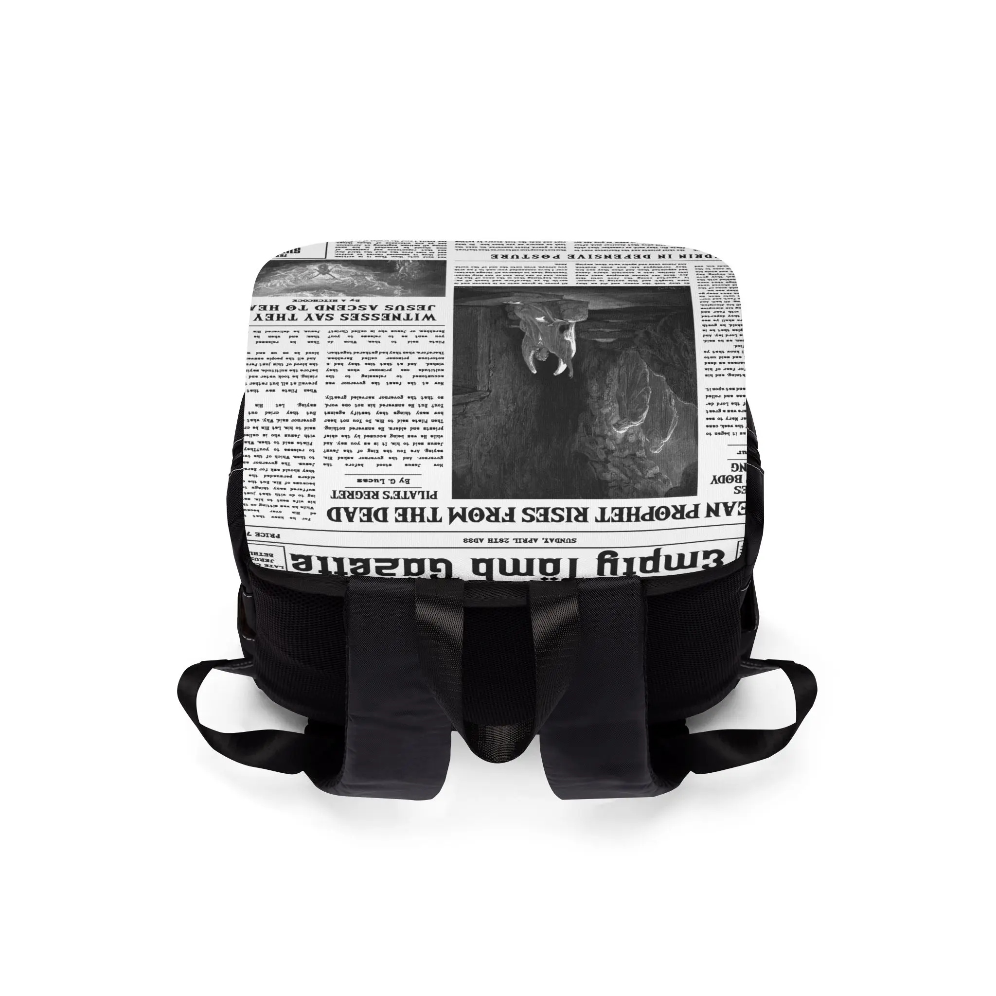 Carry the message of hope boldly with this Casual Shoulder Backpack featuring the striking Empty Tomb Gazette design. The vintage newspaper-style headline — “Prophet Rises from the Dead!” — is printed prominently to inspire faith and spark conversations wherever you go.