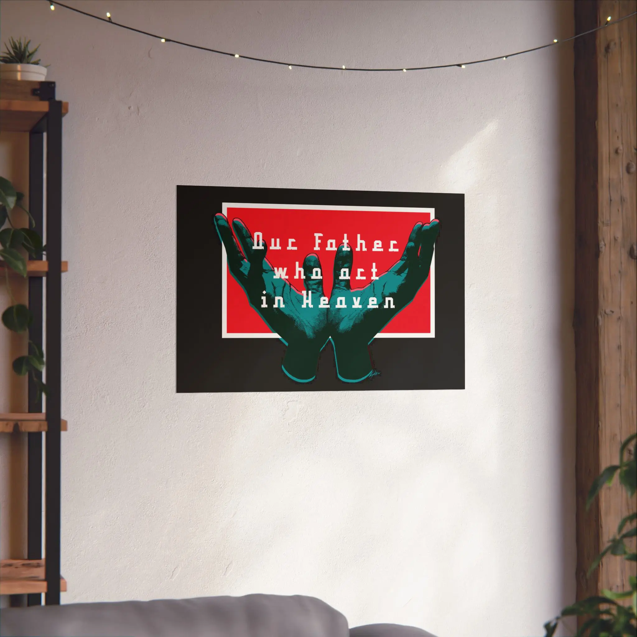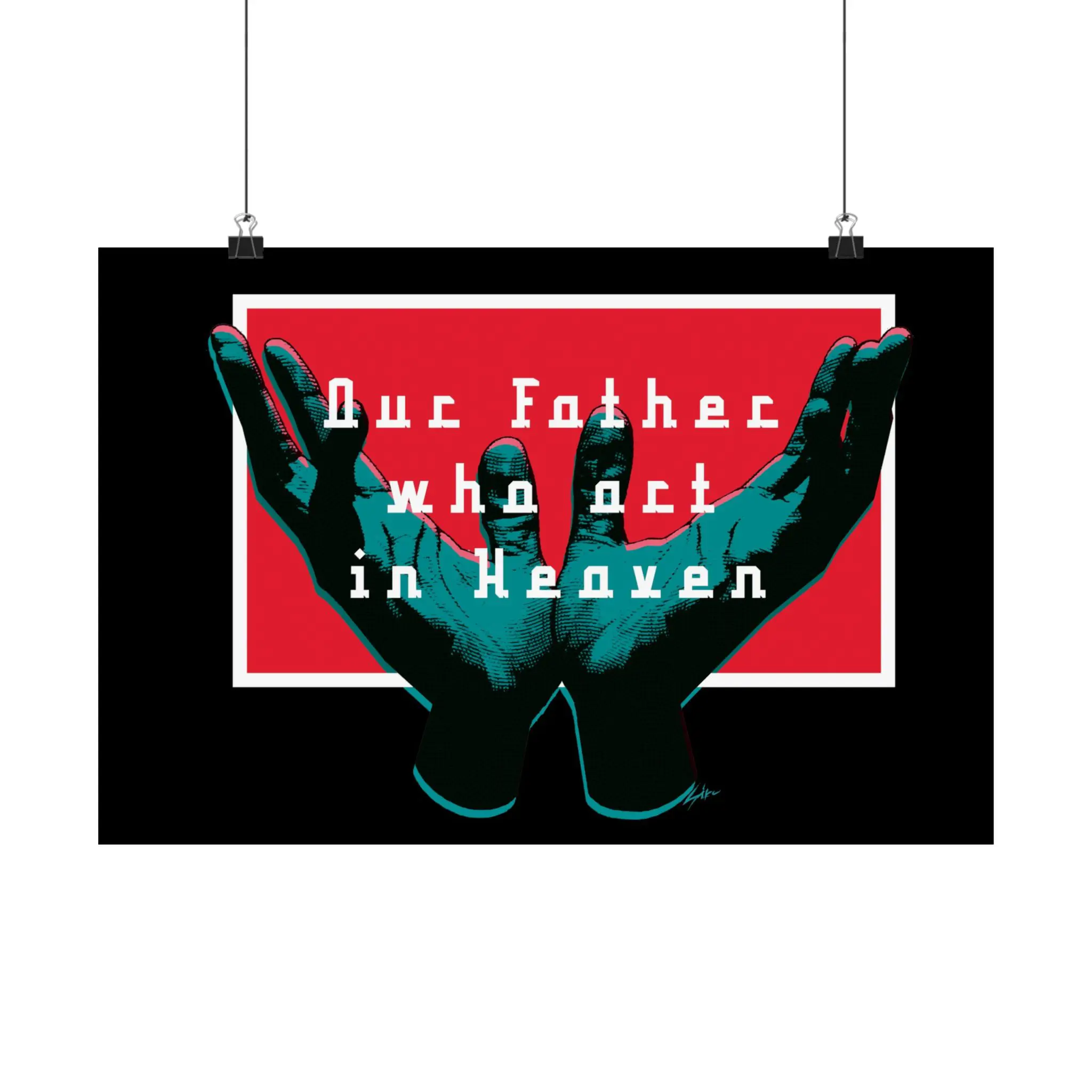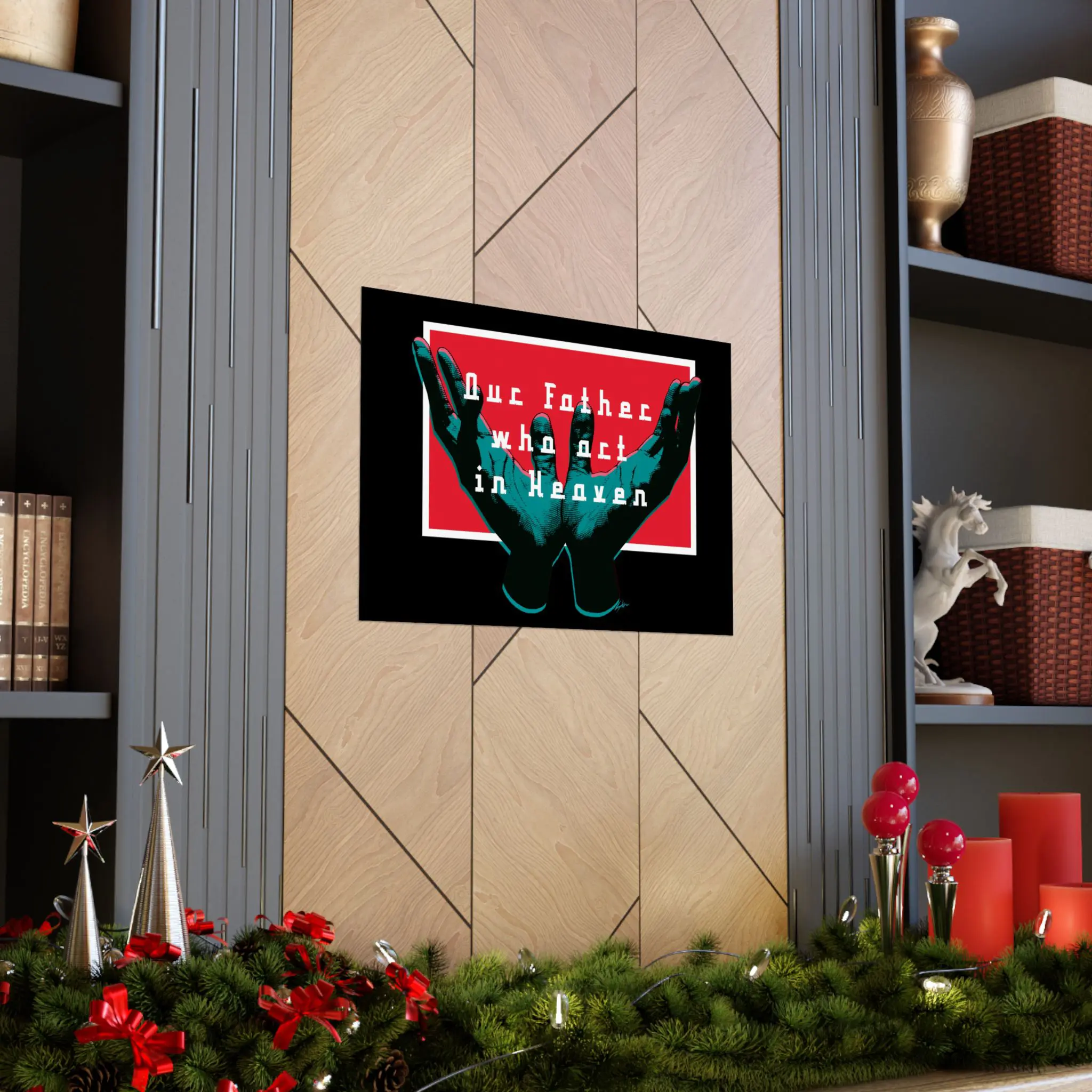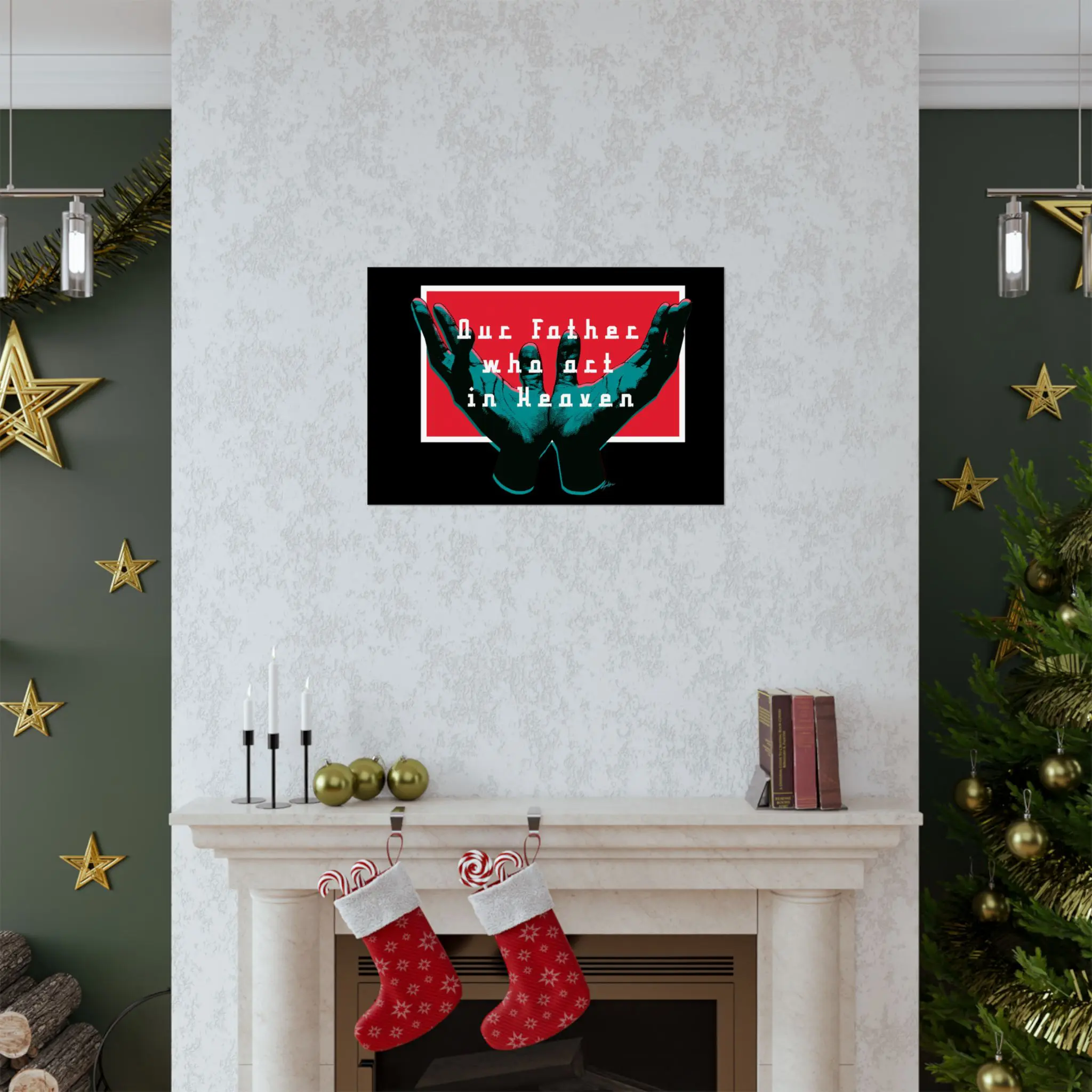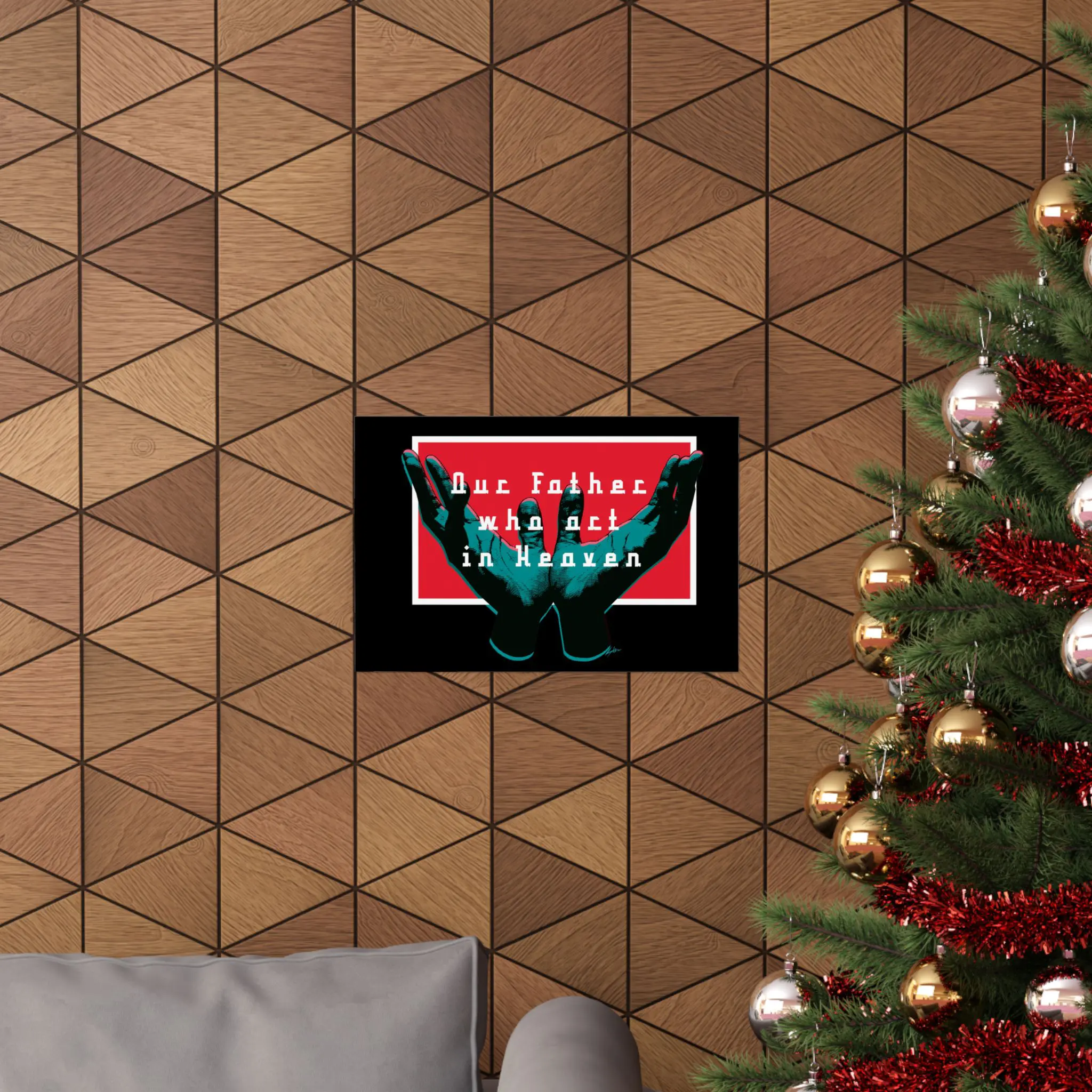 This bold and reverent poster showcases the phrase “Our Father in Heaven” in English, set within a powerful red interior framed by a solid black background. The dramatic color contrast conveys both intensity and intimacy—symbolizing divine authority and sacrificial love. Inspired by Matthew 6:9, this design is perfect for prayer rooms, worship spaces, or as a gift that speaks to the heart of faith.
