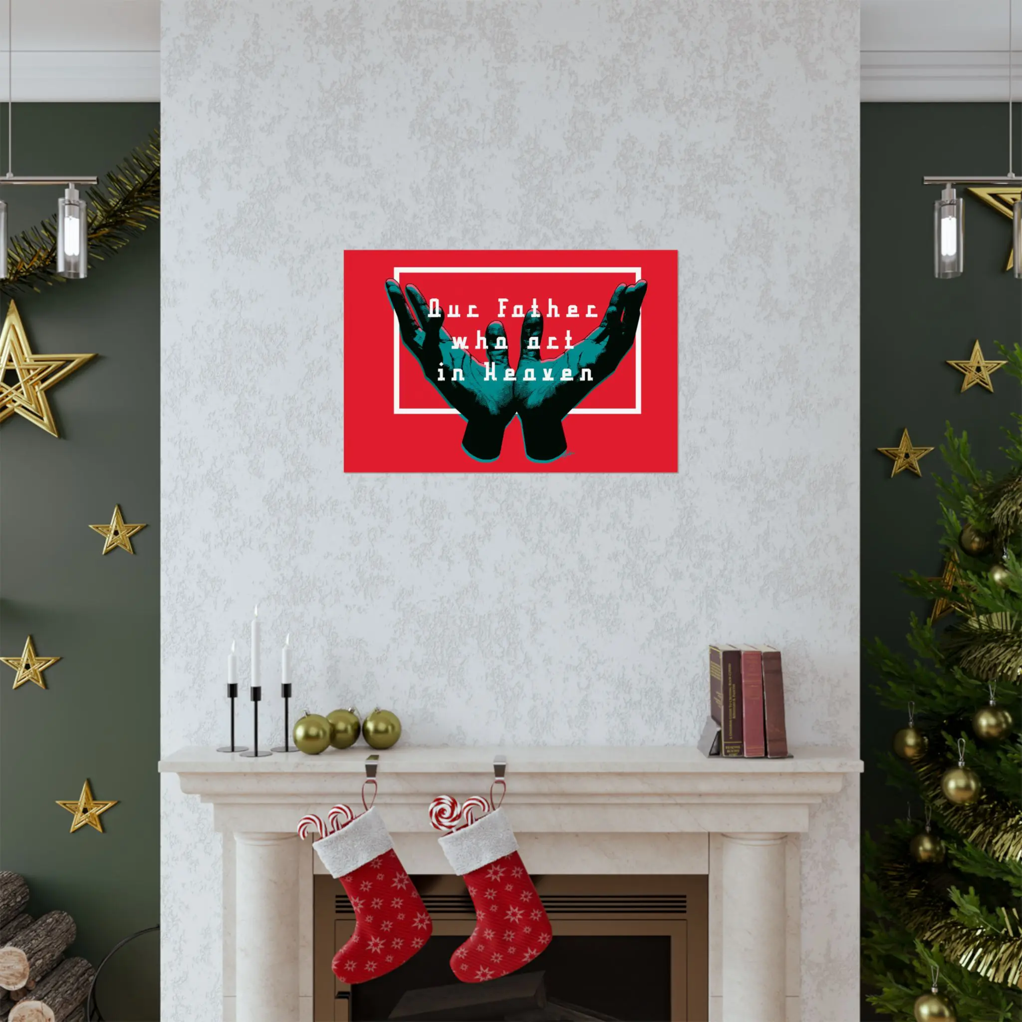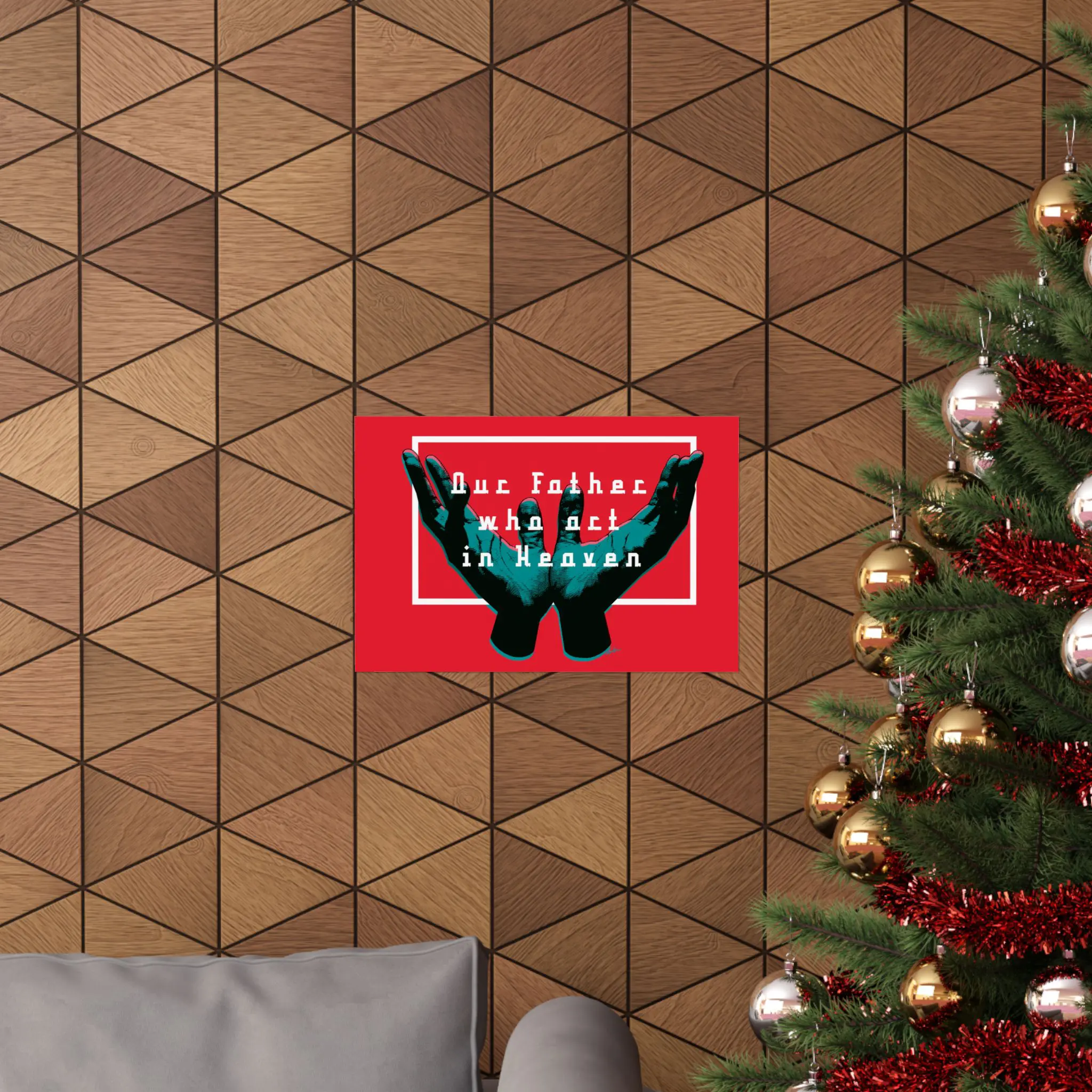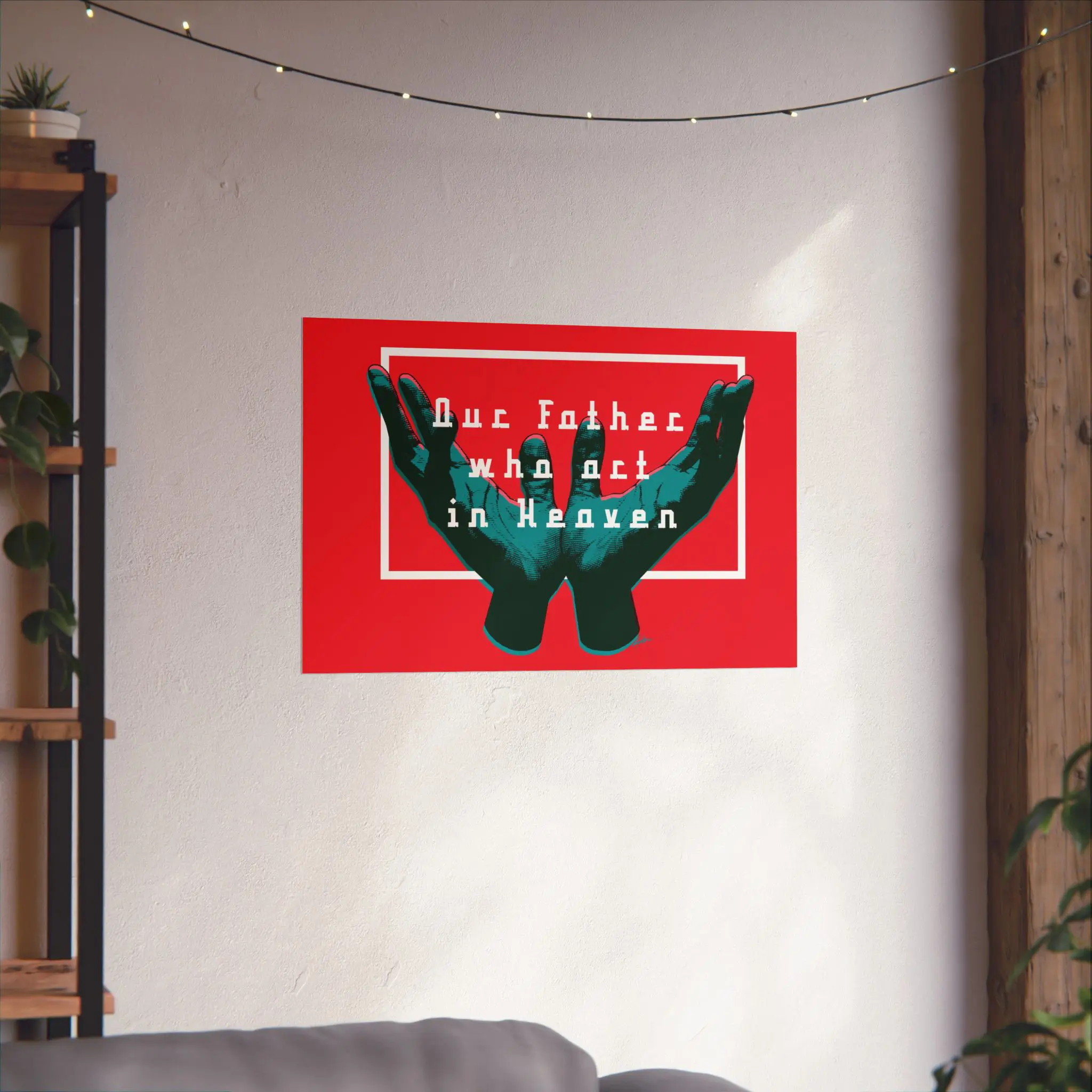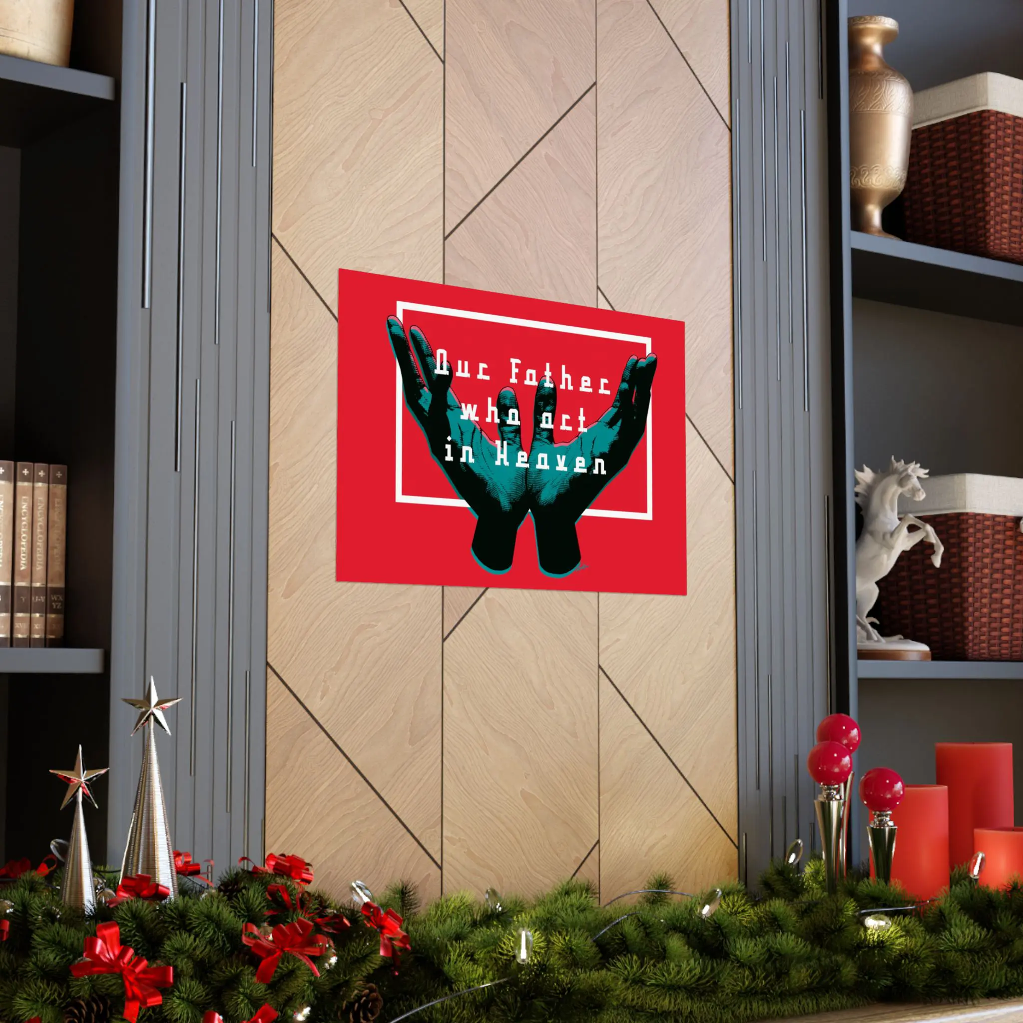 This powerful poster features the phrase “Our Father in Heaven” in English, set against a deep red interior surrounded by a rich red border. The monochromatic palette evokes intensity, love, and reverence—creating a bold and focused visual inspired by Matthew 6:9. Ideal for sacred spaces, home décor, or gifts that speak from the heart, this design draws attention to the divine with depth and simplicity.
