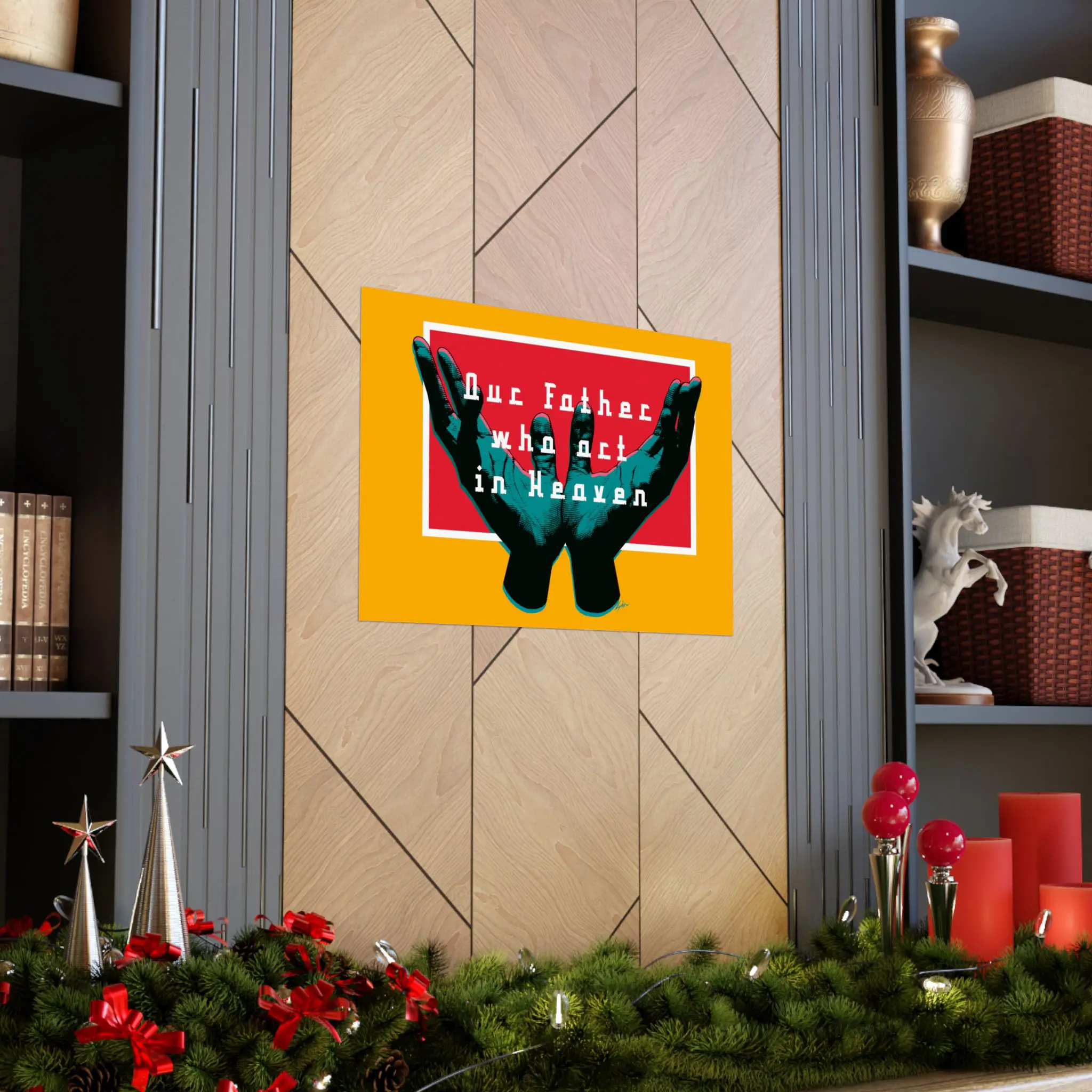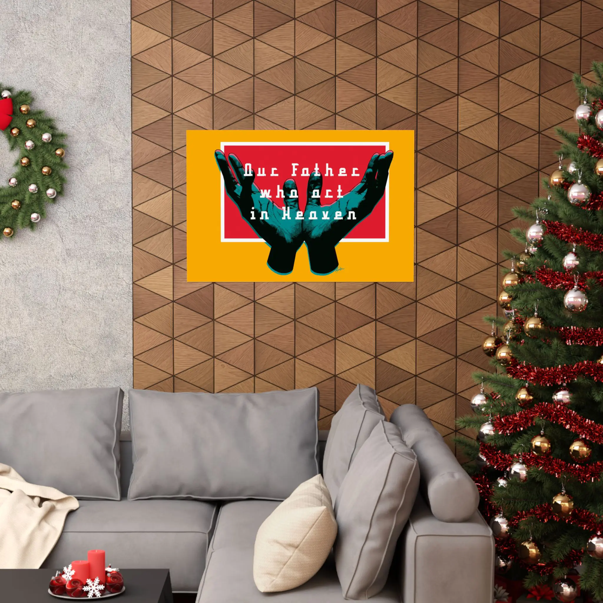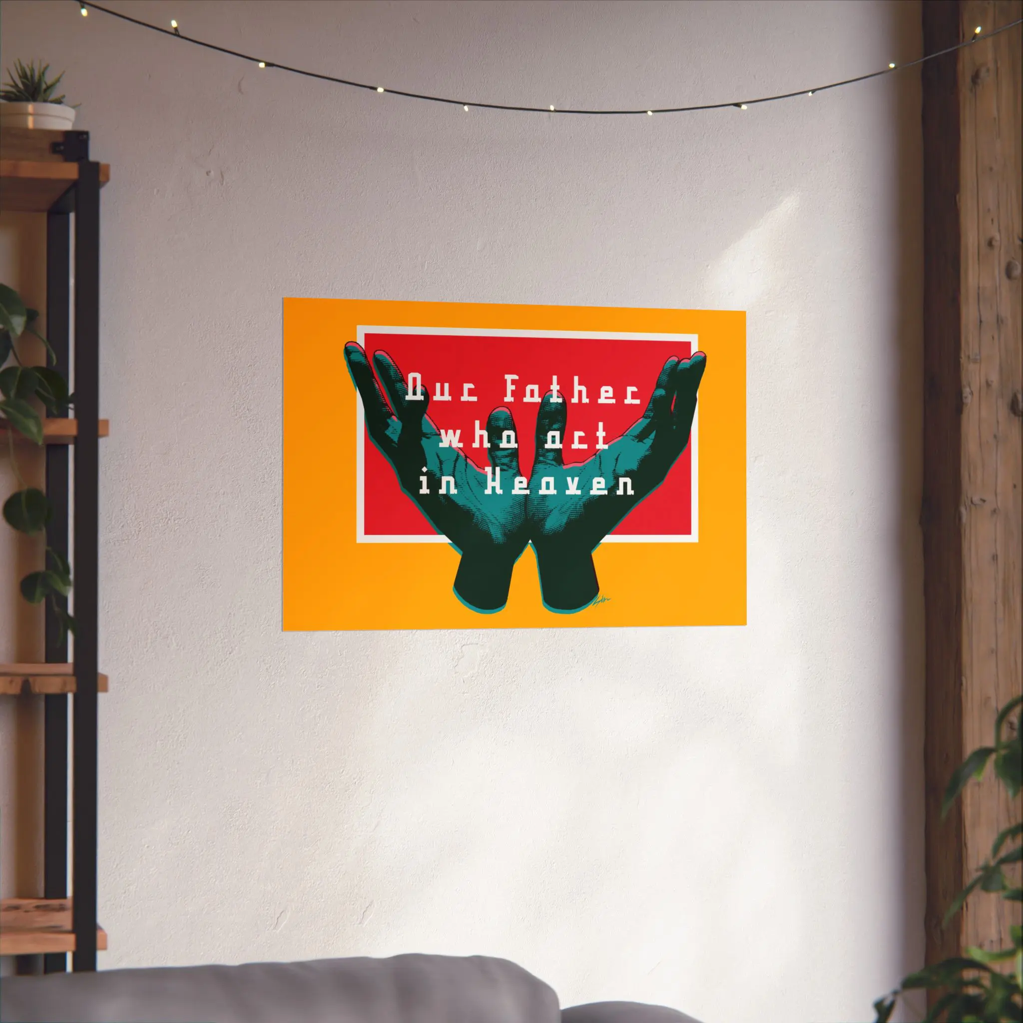 This bold and vibrant poster features the phrase “Our Father in Heaven” in English, displayed over a deep red interior framed by a radiant orange background. The warm tones evoke passion, devotion, and divine light—creating a powerful visual expression of Matthew 6:9. Perfect for personal spaces, prayer rooms, or gifting, this piece is a meaningful reminder of God’s presence and authority.