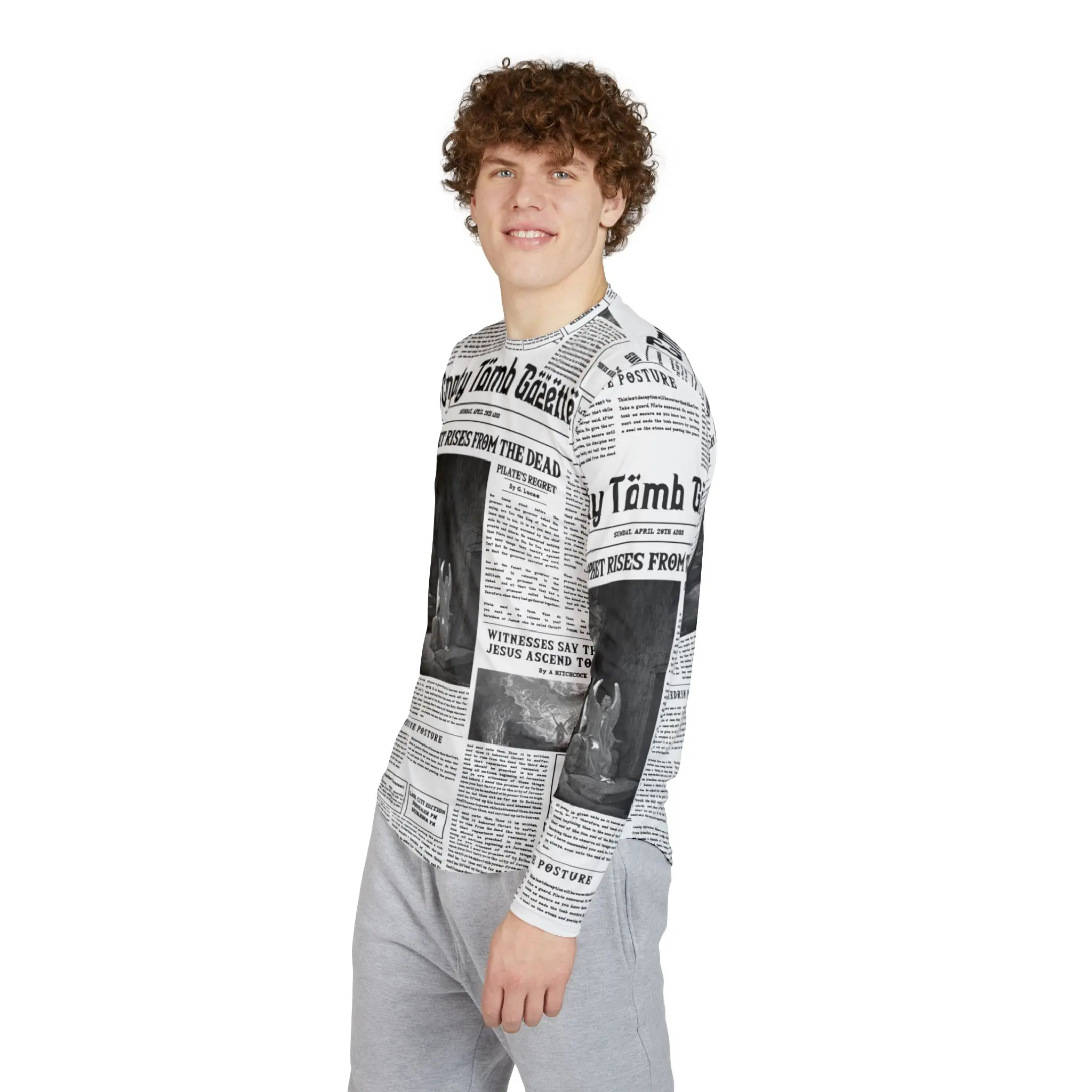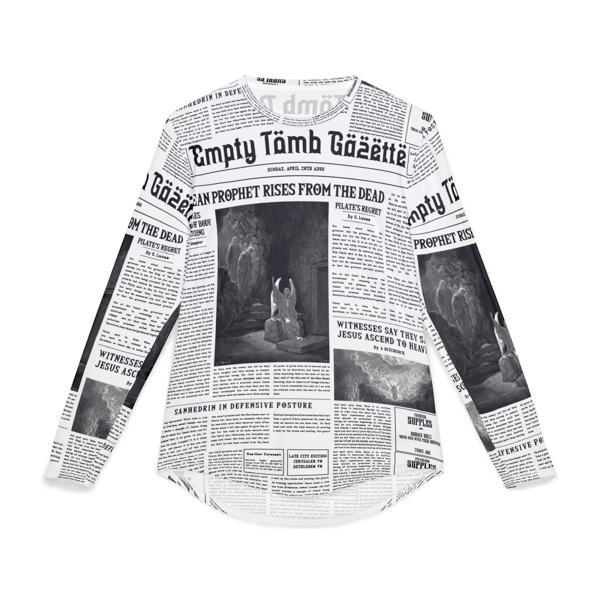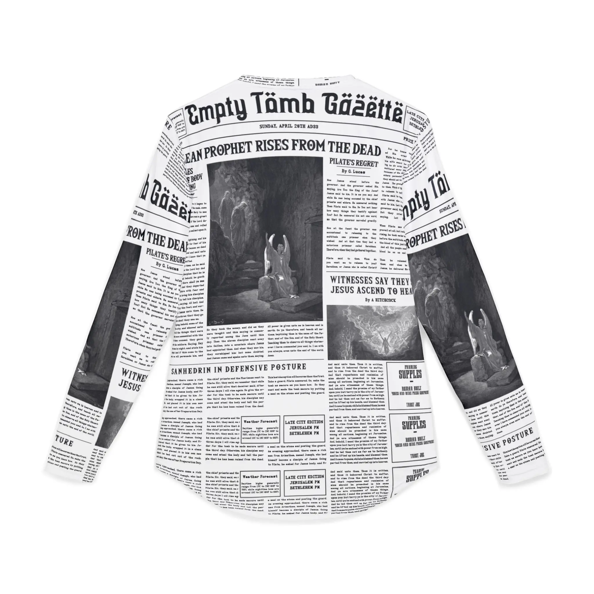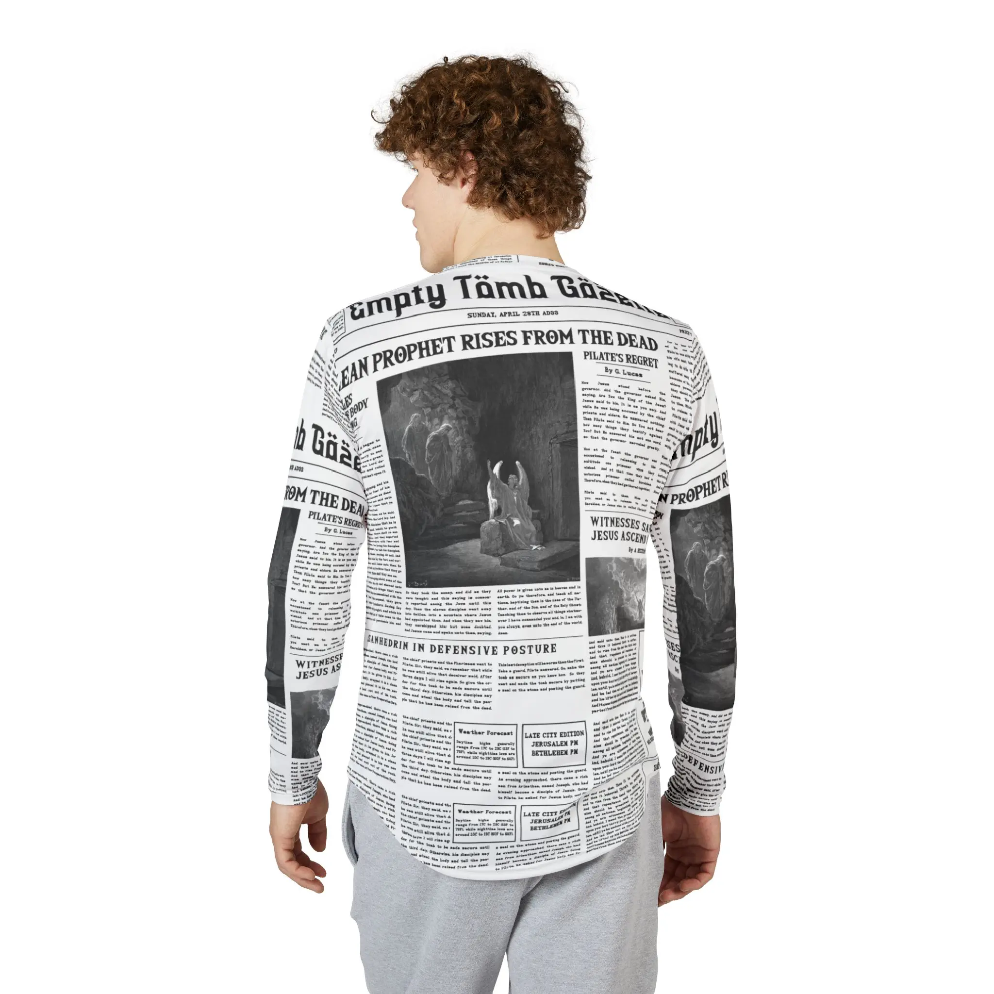Make a bold statement of faith with this men’s white long sleeve shirt featuring the “Empty Tomb Gazette” vintage newspaper-style design. Proclaiming the victorious headline “The Tomb Is Empty – He Is Risen!” this shirt blends timeless truth with a unique, eye-catching look.