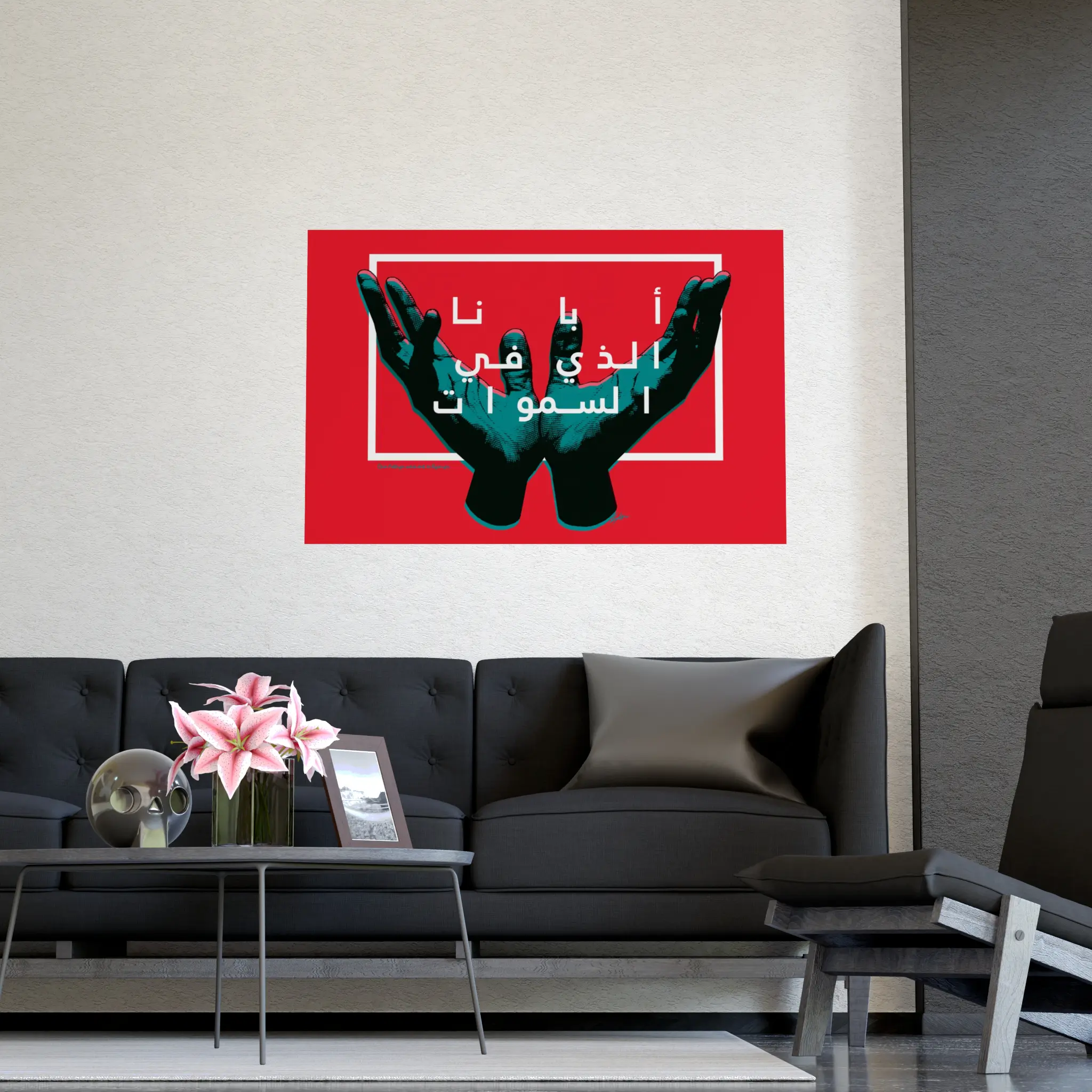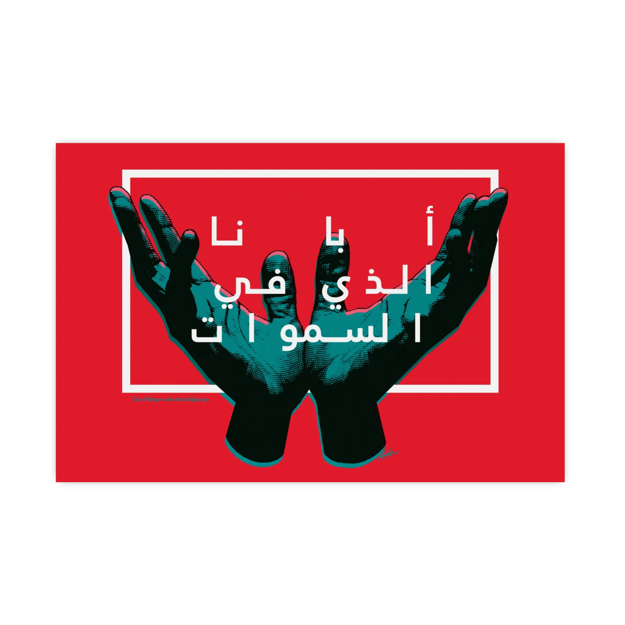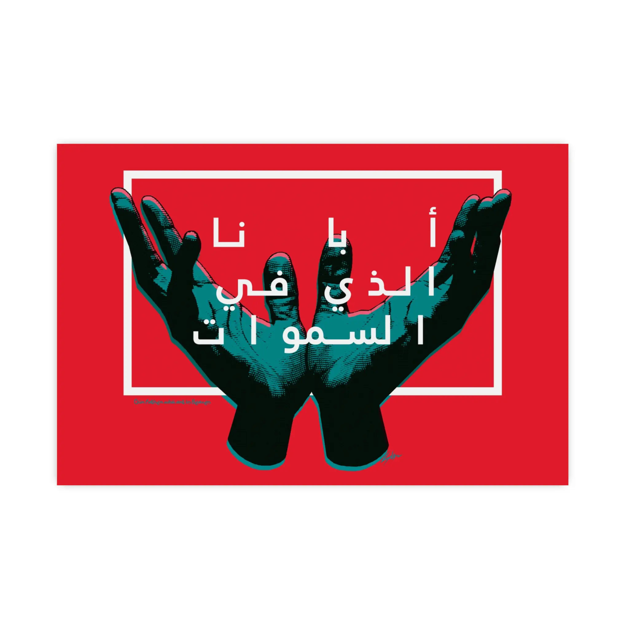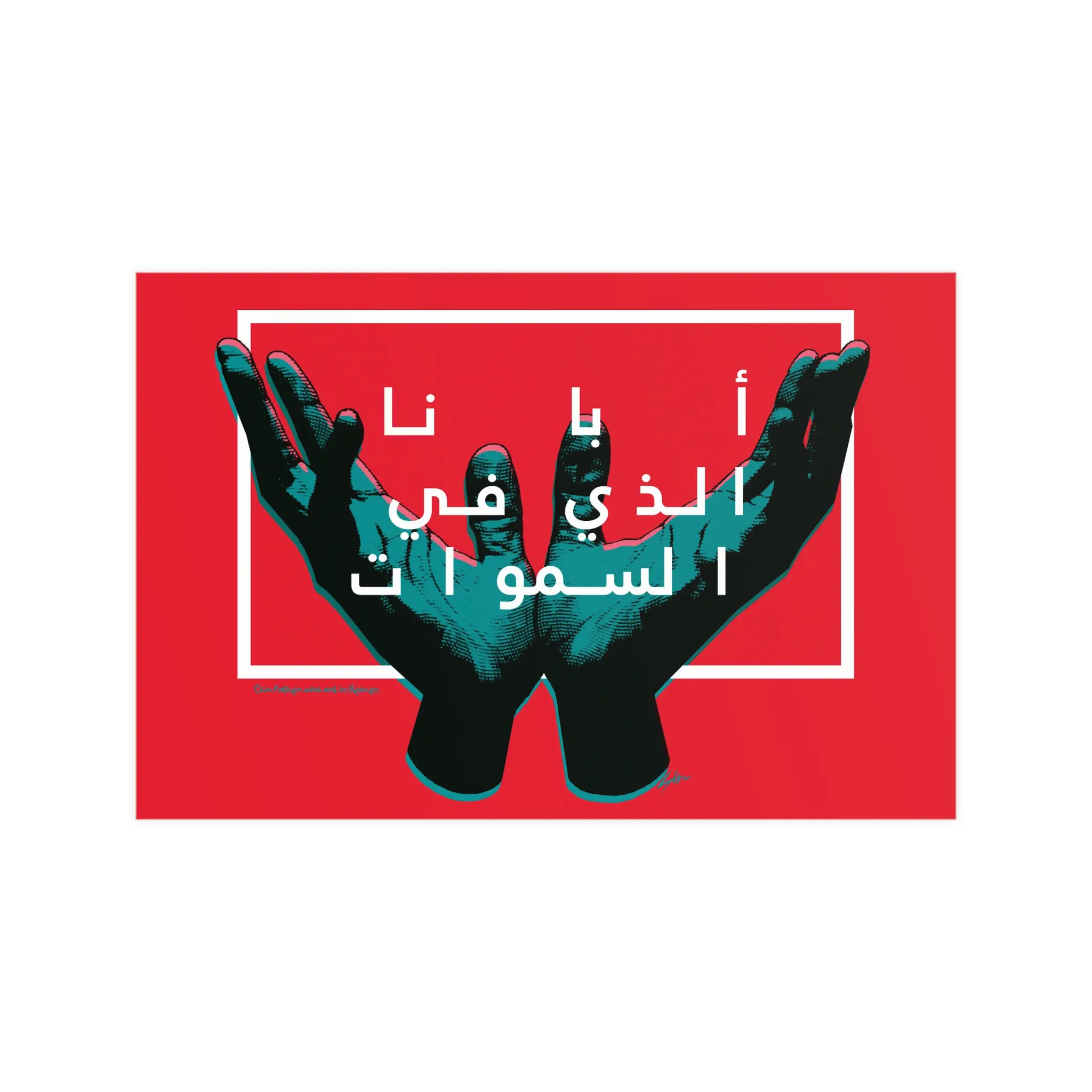 This bold poster features the words “Our Father in Heaven” in beautifully stylized Arabic calligraphy above hands lifted in reverence. The deep, unified red background evokes themes of love, sacrifice, and divine power—creating a striking and meaningful presence in any space.