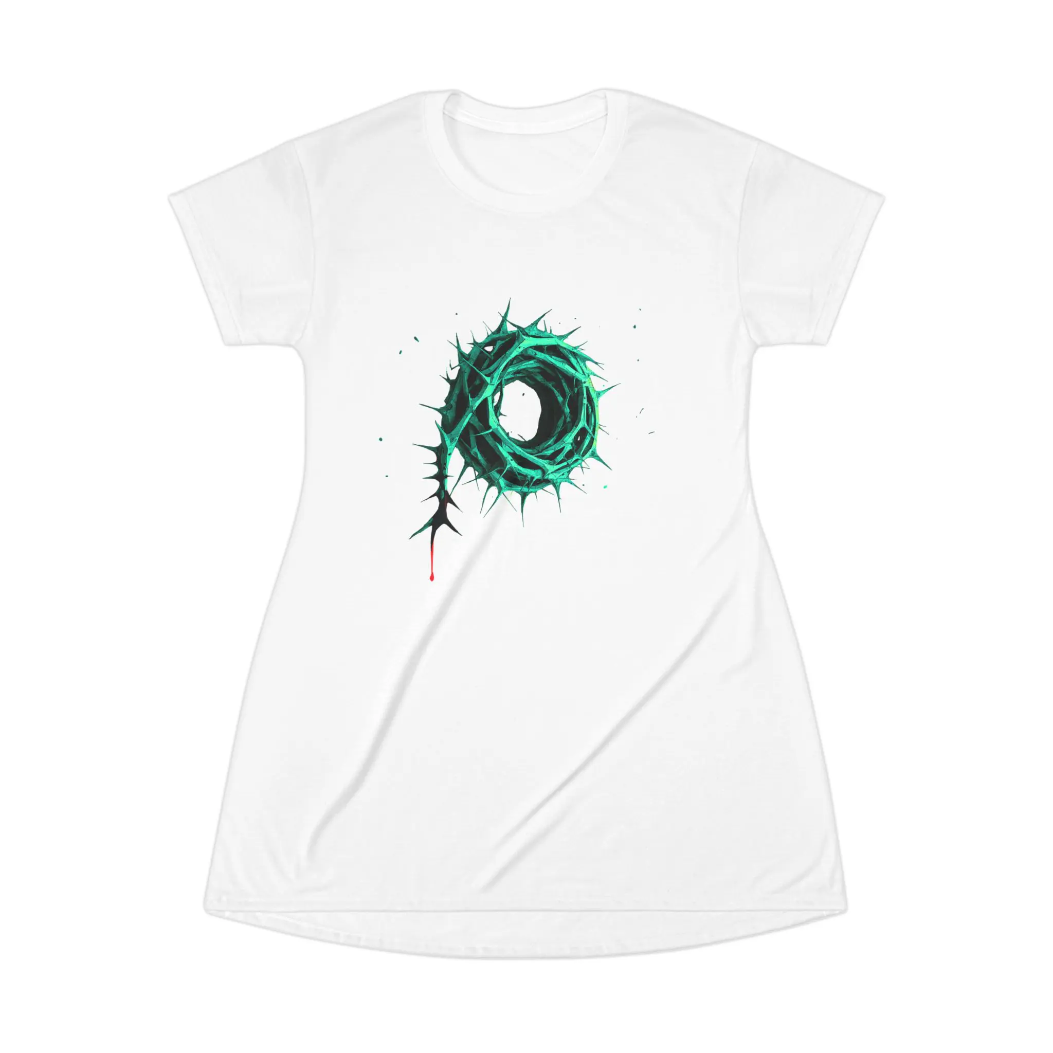 This stylish white T-shirt dress features a striking green Crown of Thorns design, symbolizing Christ’s sacrifice and the hope of redemption. Combining modern fashion with deep spiritual meaning, it offers a comfortable, relaxed fit perfect for casual wear, gatherings, or as a statement piece of faith.