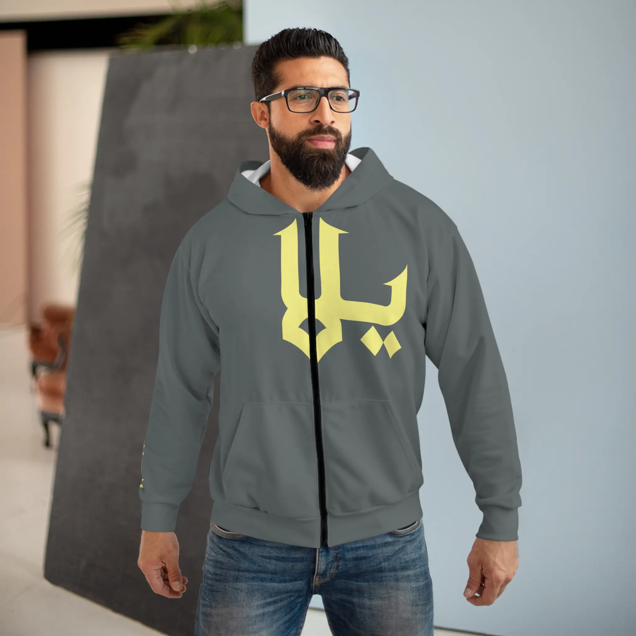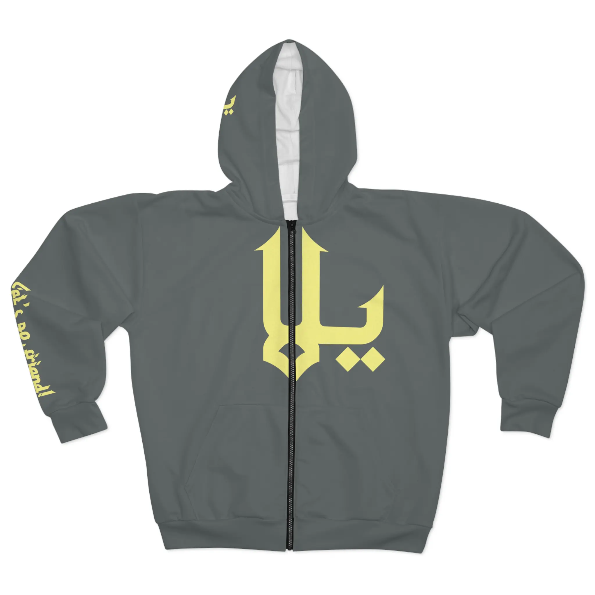 Step out in bold style with this dark grey hoodie featuring the Arabic word “Yalla” (يلا) in a striking yellow symbol on the front — a vibrant call to action meaning “Let’s go!” The sleeve completes the message with “Let’s Go, Friend” subtly printed for extra inspiration. Designed for comfort and everyday movement, this hoodie is perfect for those living with purpose, energy, and community in mind.