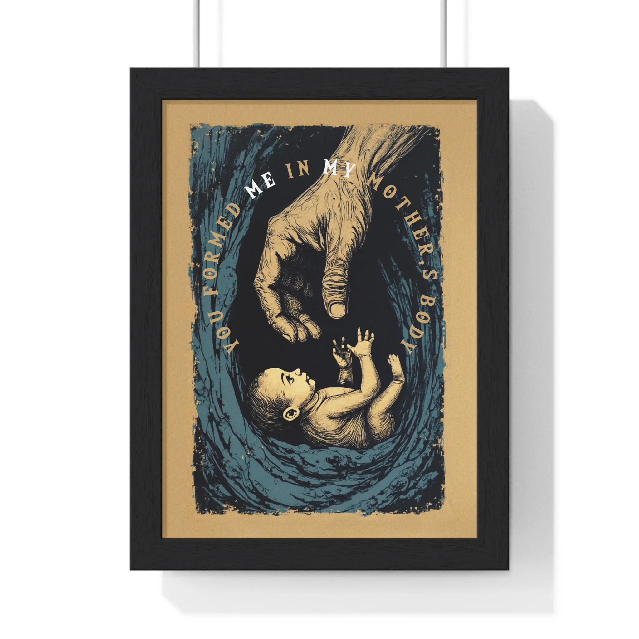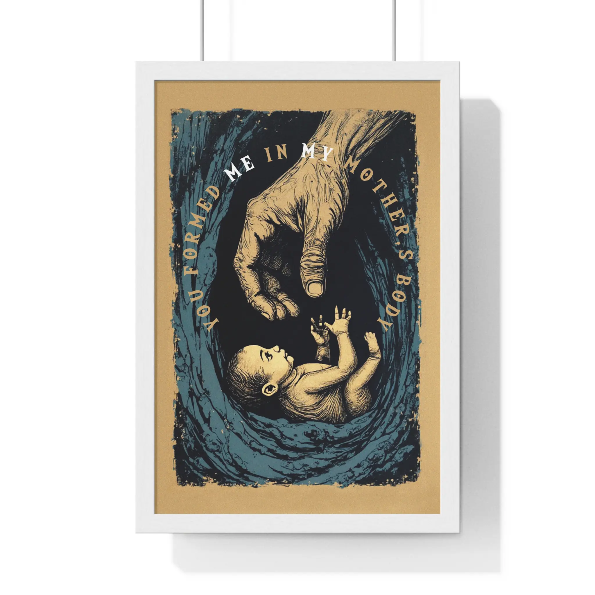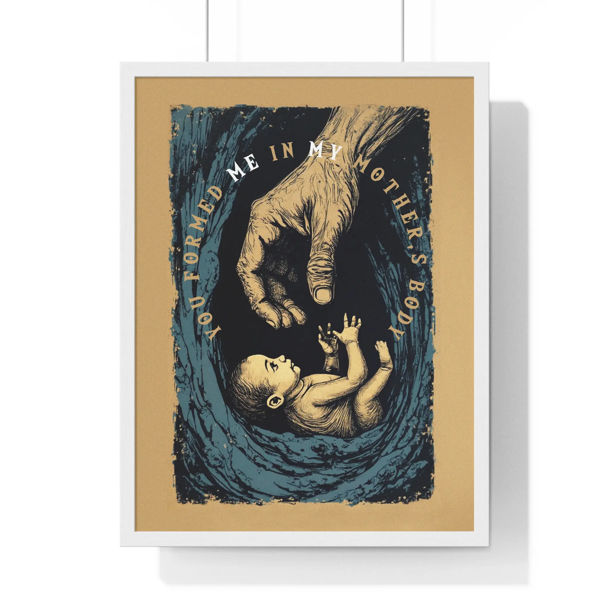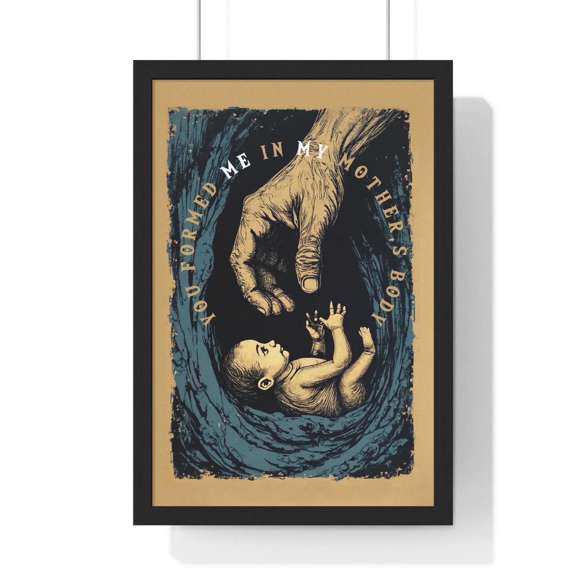 Celebrate the wonder of divine creation with this beautifully framed vertical poster, featuring the powerful words from Psalm 139:13: “You formed me in my mother’s body.” A perfect addition to nurseries, prayer spaces, or anywhere a reminder of God’s intentional design is welcome. Thoughtfully designed to stir reflection and gratitude, this piece speaks to identity, purpose, and the sacredness of life.