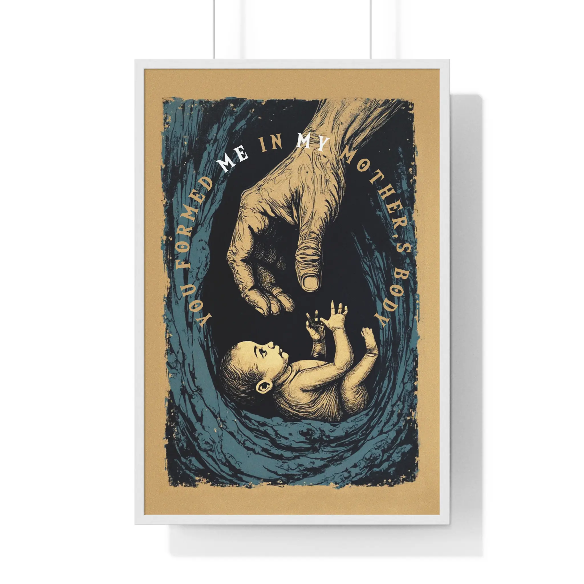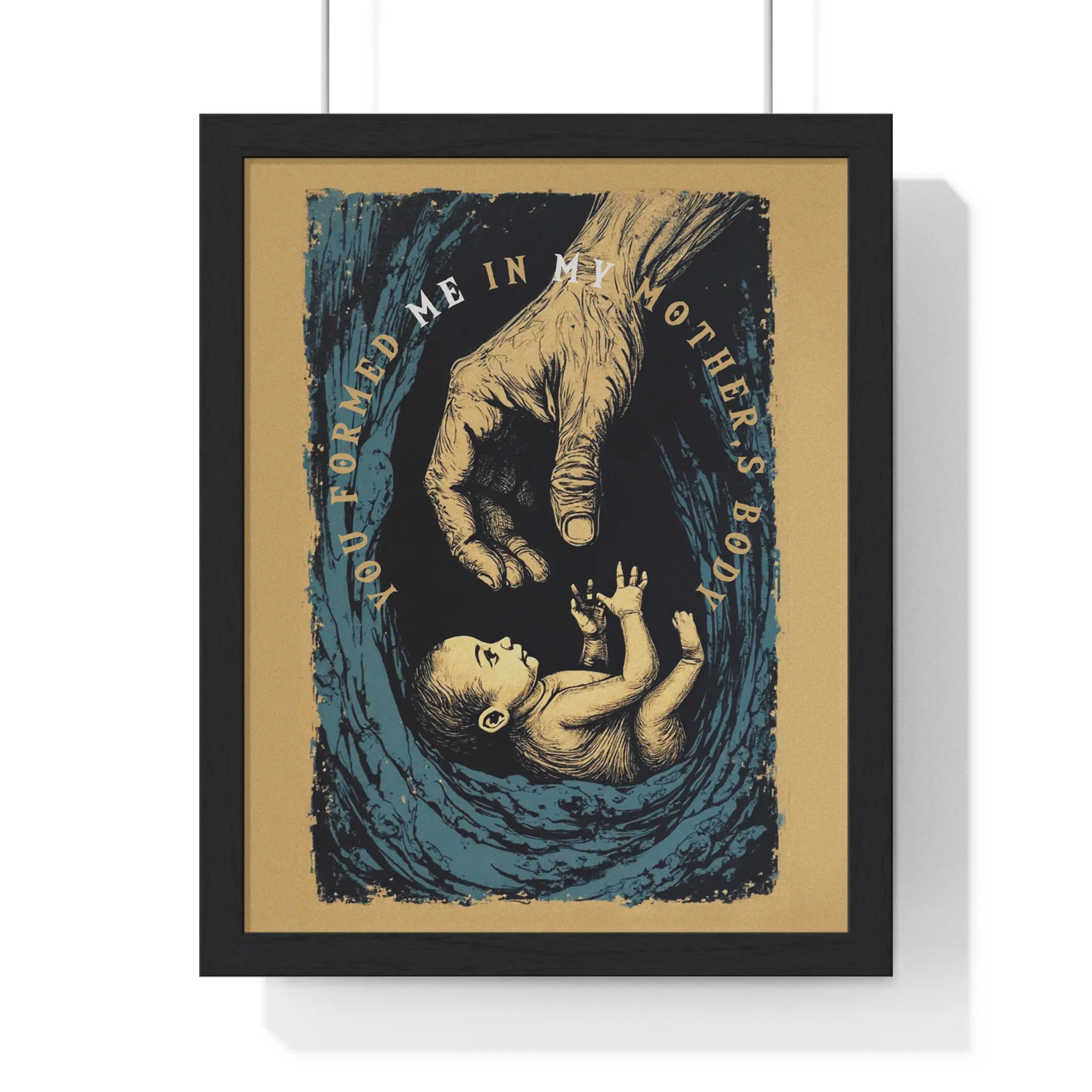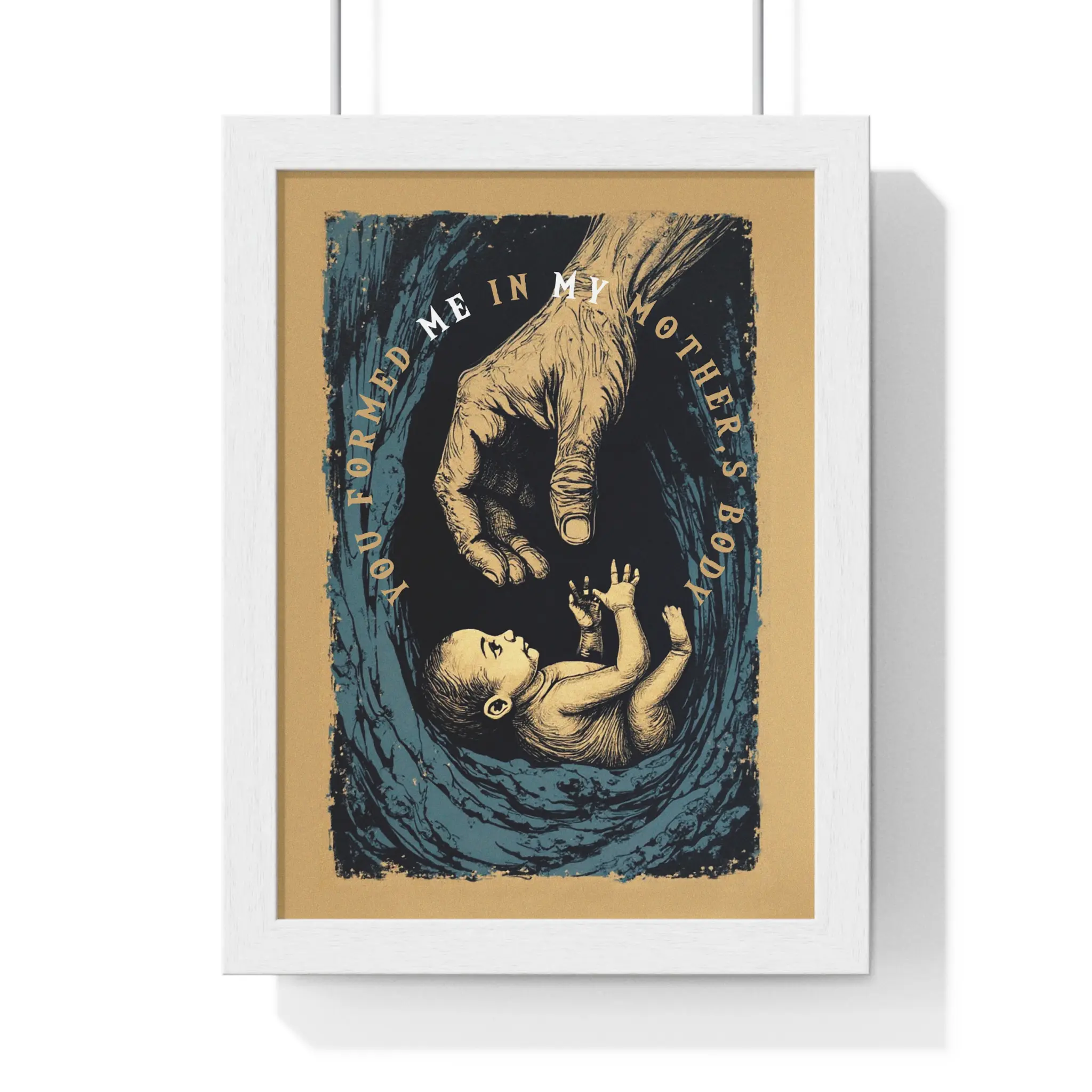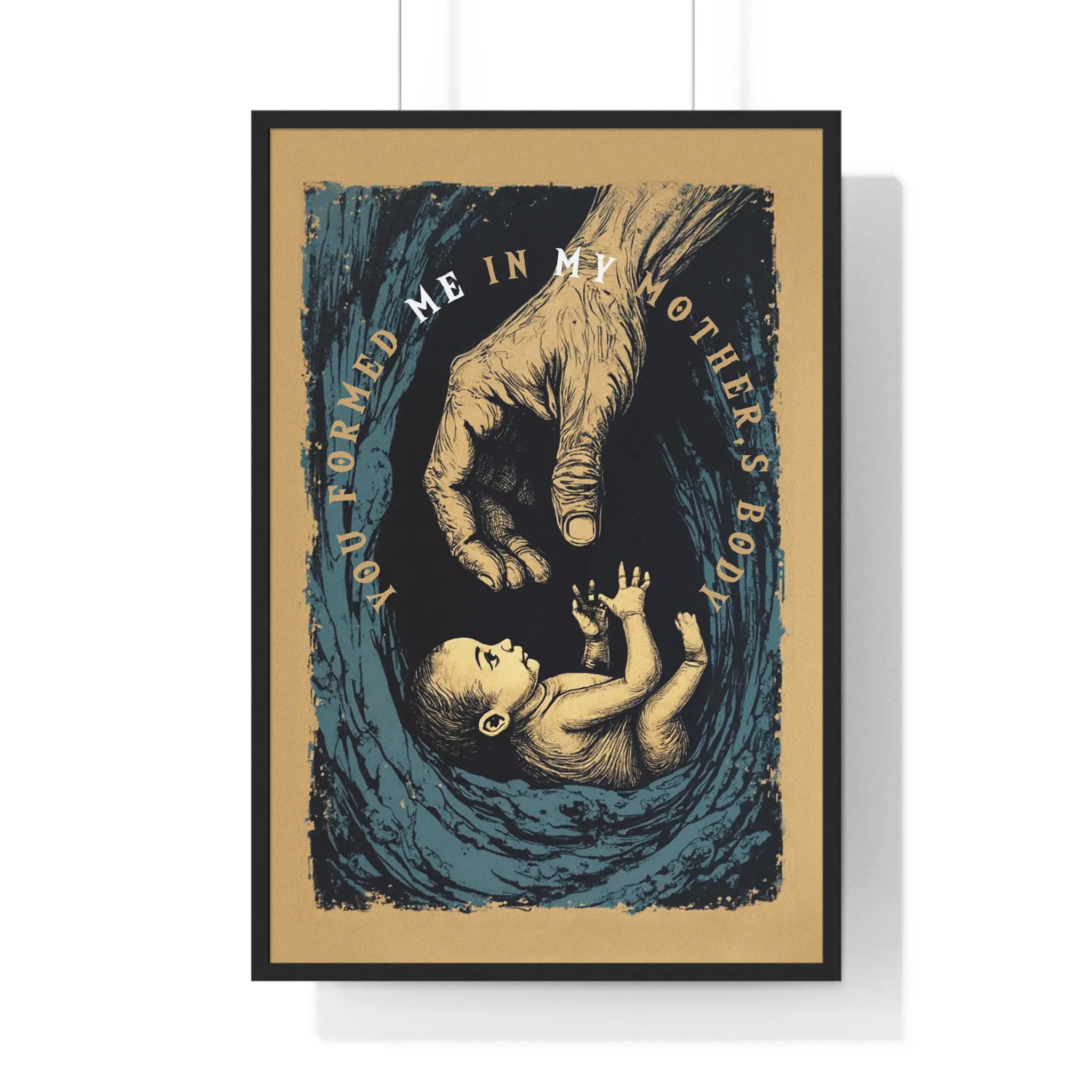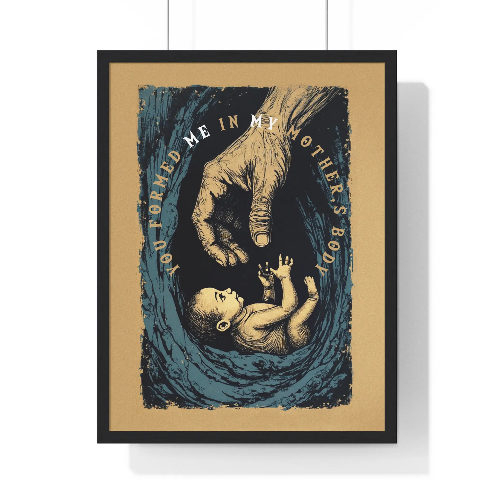 Celebrate the wonder of divine creation with this beautifully framed vertical poster, featuring the powerful words from Psalm 139:13: “You formed me in my mother’s body.” A perfect addition to nurseries, prayer spaces, or anywhere a reminder of God’s intentional design is welcome. Thoughtfully designed to stir reflection and gratitude, this piece speaks to identity, purpose, and the sacredness of life.